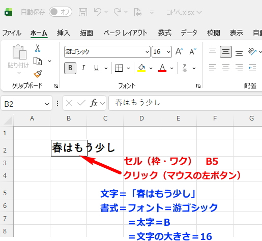 セル番号 B5 に小さな「春はもう少し」の文字は入りましたか?、そう、「値」というのはセルに入っていた中身=文字 文字の列(2個以上・複数) 通常は「文字列」と呼びます、セル番号B2に入っていた 「文字列」と「書式」の中の「文字列」だけを「貼り付けました」