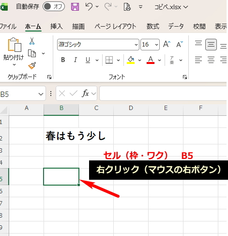 セル番号(枠)B5 に操作していきます、マウスボタンは、右側の「右クリック」ですよ、通常の左側「クリック」ではないです(左クリックというい方はパソコン初回の人ようでしたよね)