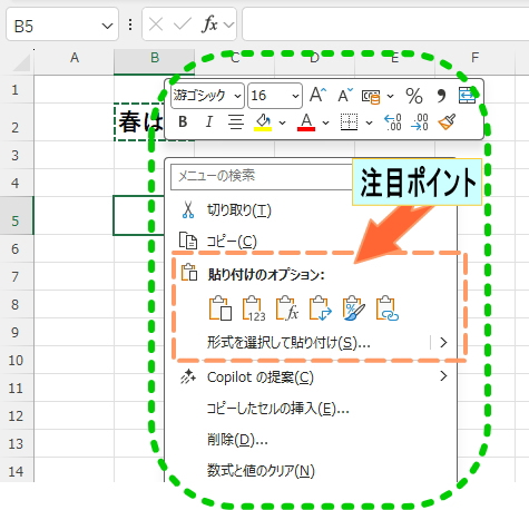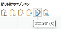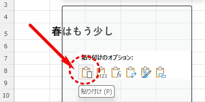 「注目ポイント」に「貼り付けのオプション」の中に。6個のアイコン(マーク画像)があります、あわててクリックしないで、マウスカーソル(矢印)をそのアイコンに重ねてください