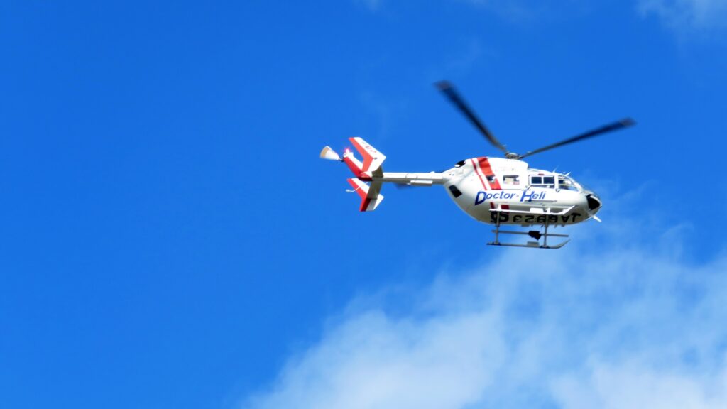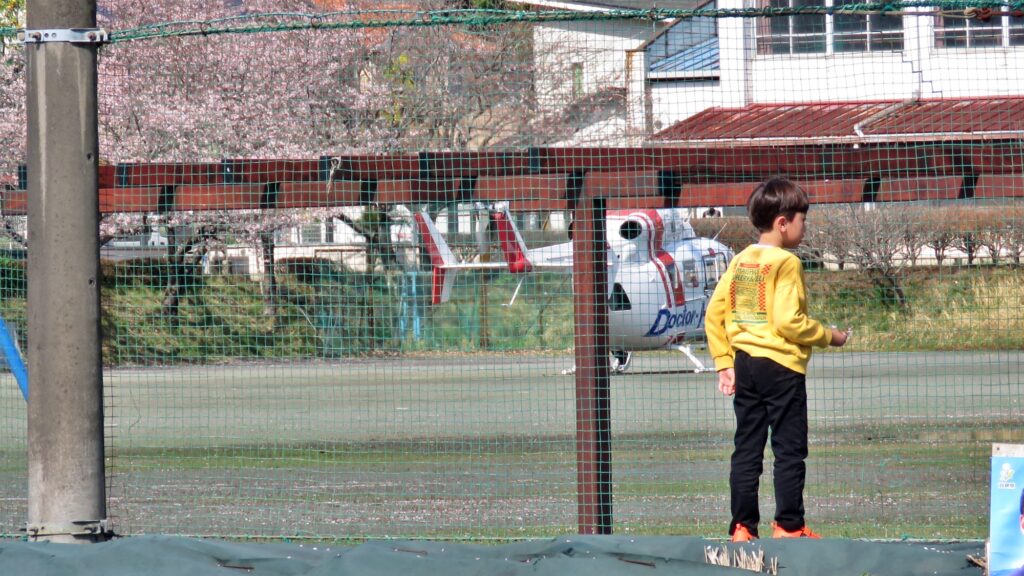 向田小学校校庭にドクターヘリが降りてきました、緊急搬送の為です、是非ご無事で良くなって下さい、