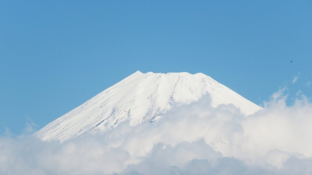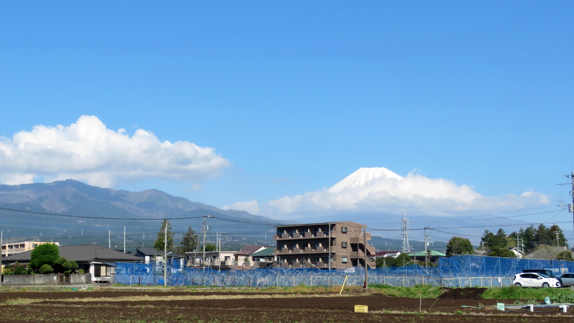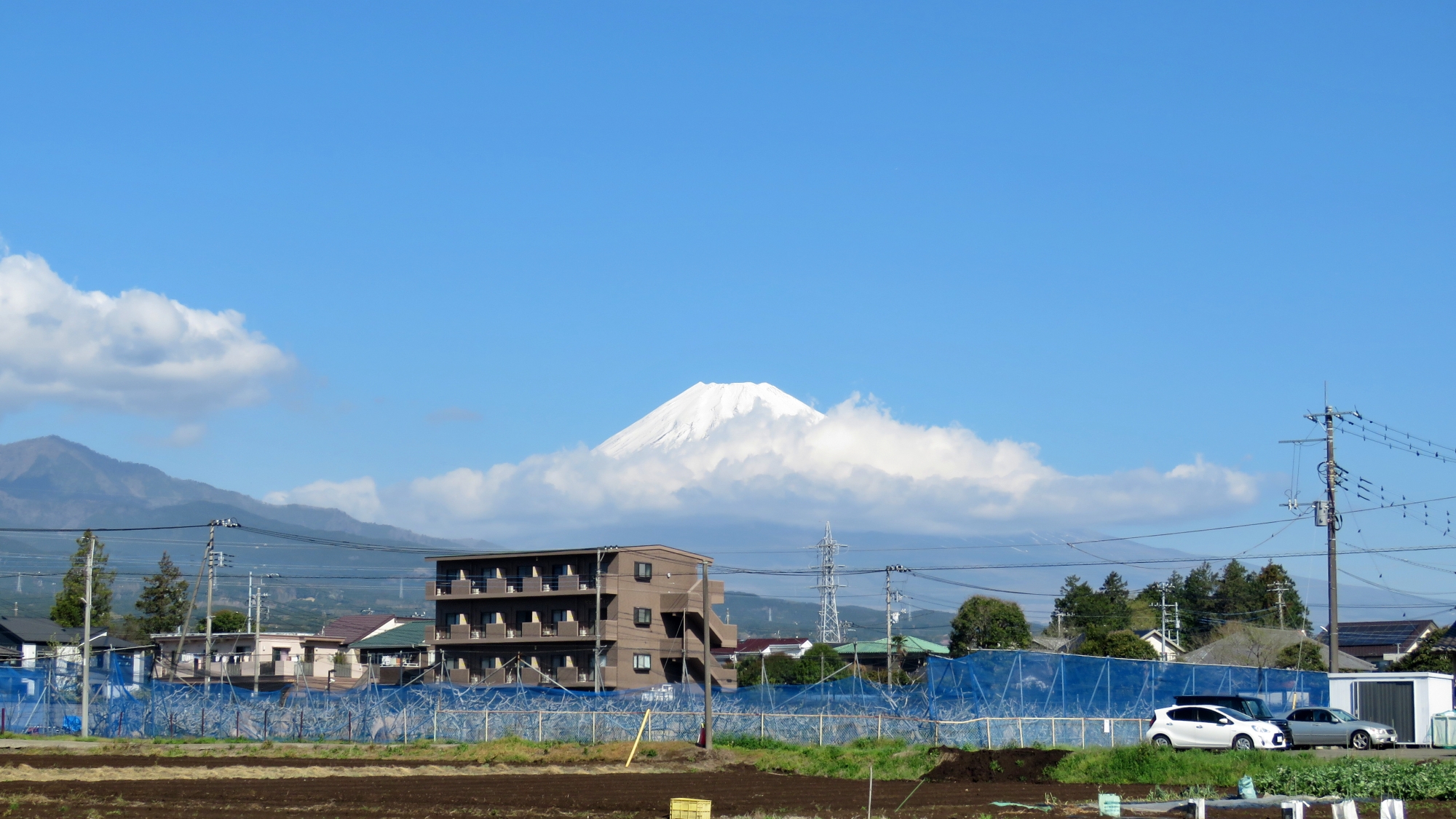 ウォーキング途中 富士山見えた |パソコン直し屋データピット 季節と風景 2026.04.03 昨日の土砂降りの雨から、今日は気持ちのいい晴れです、朝から短時間のウォーキングをしました、富士山の周りはまだ雲が残っています、風も全然ない穏やか日なので、こんな日は富士の裾野まですっきり見えるのは昼過ぎからでしょう、気持ちいウォーキングです。